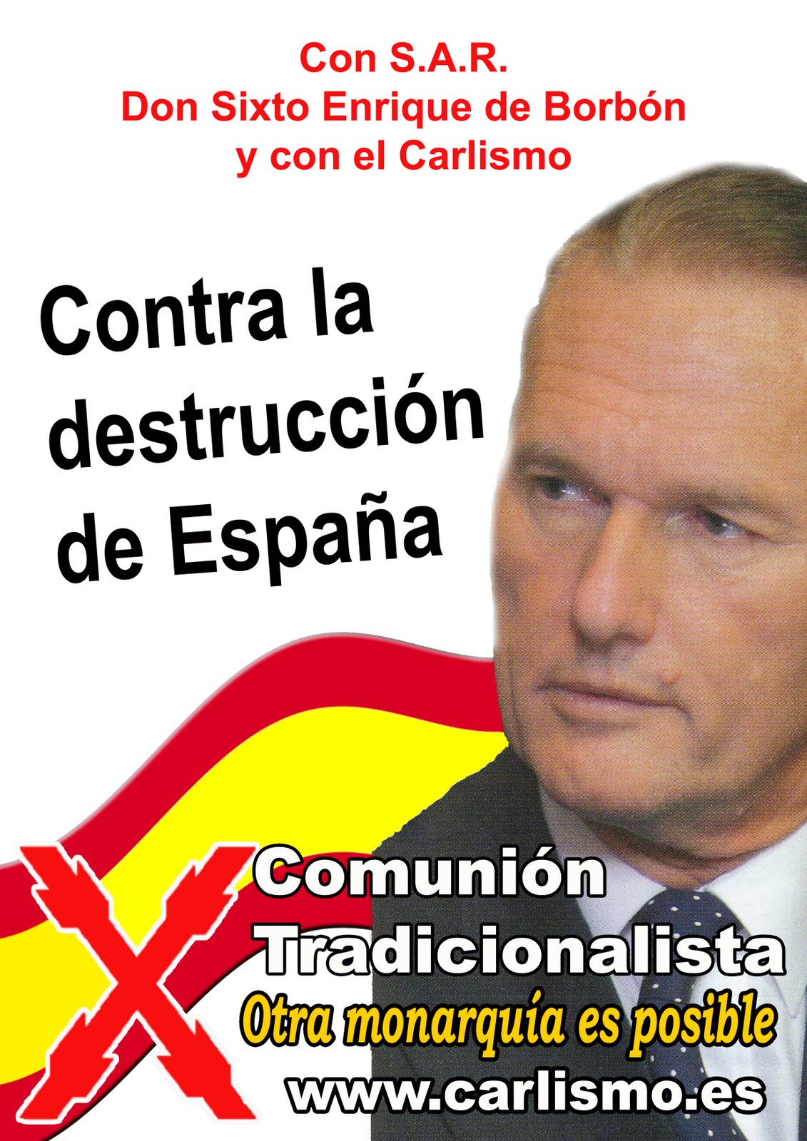 A perro enfermo todo son pulgas. Gracias a la democracia nuestra sociedad ha entrado en fase agónica y sólo cabe preguntarse si morirá despiezada por los separatistas, si será deglutida de la avasalladora globalización o si será pasto del hormiguero islámico que crece en su interior. Razón tenía el Guerra cuando dijo que tras el cambio preconizado por el PSOE, a España no iba conocerla ni la madre que la parió: pronto no quedarán de ella sino piltrafas de un corrupto cadáver. De nada vale la listeza de curanderos que aplican cataplasmas y pomadas. La Comunión Tradicionalista entiende que sólo cabe ir a por todas, como a por todas va el PSOE en su afán corruptor de cuanto huela a orden cristiano. Por ello, y porque su honor le impide recurrir a engañosas tretas para ganar votos, nunca se fundirá con partido alguno que no reconozca la totalidad de los principios que ella sigue manteniendo. Lo cual no le ha impedido apoyar las acciones bien encaminadas que otros han organizado (bastante inútiles, por cierto), y no le impedirá emprender episódicas acciones comunes.