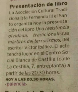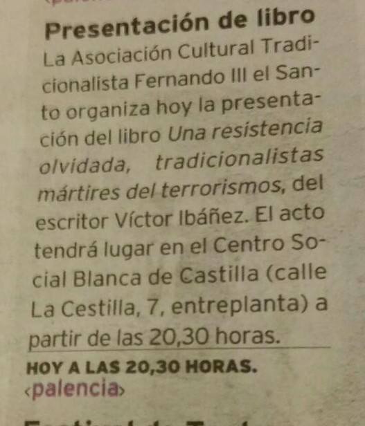 PALENCIA: Viernes 31 marzo. Presentación del libro «UNA RESISTENCIA OLVIDADA. Tradicionalistas mártires del terrorismo» (Auzolan Ediciones, 2017). Con la presencia de su autor, Víctor Javier Ibáñez Mancebo. Os esperamos a todos a las 20:30 horas en el Centro Social Blanca de Castilla, en Palencia (C/La Cestilla 5, Entreplanta)